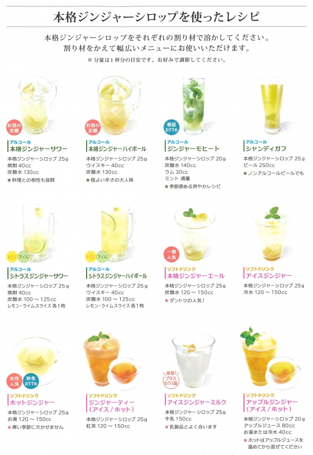ジンジャーシロップを使ったメニューもアルコール、ソフトドリンクともに色々提案してありますが、